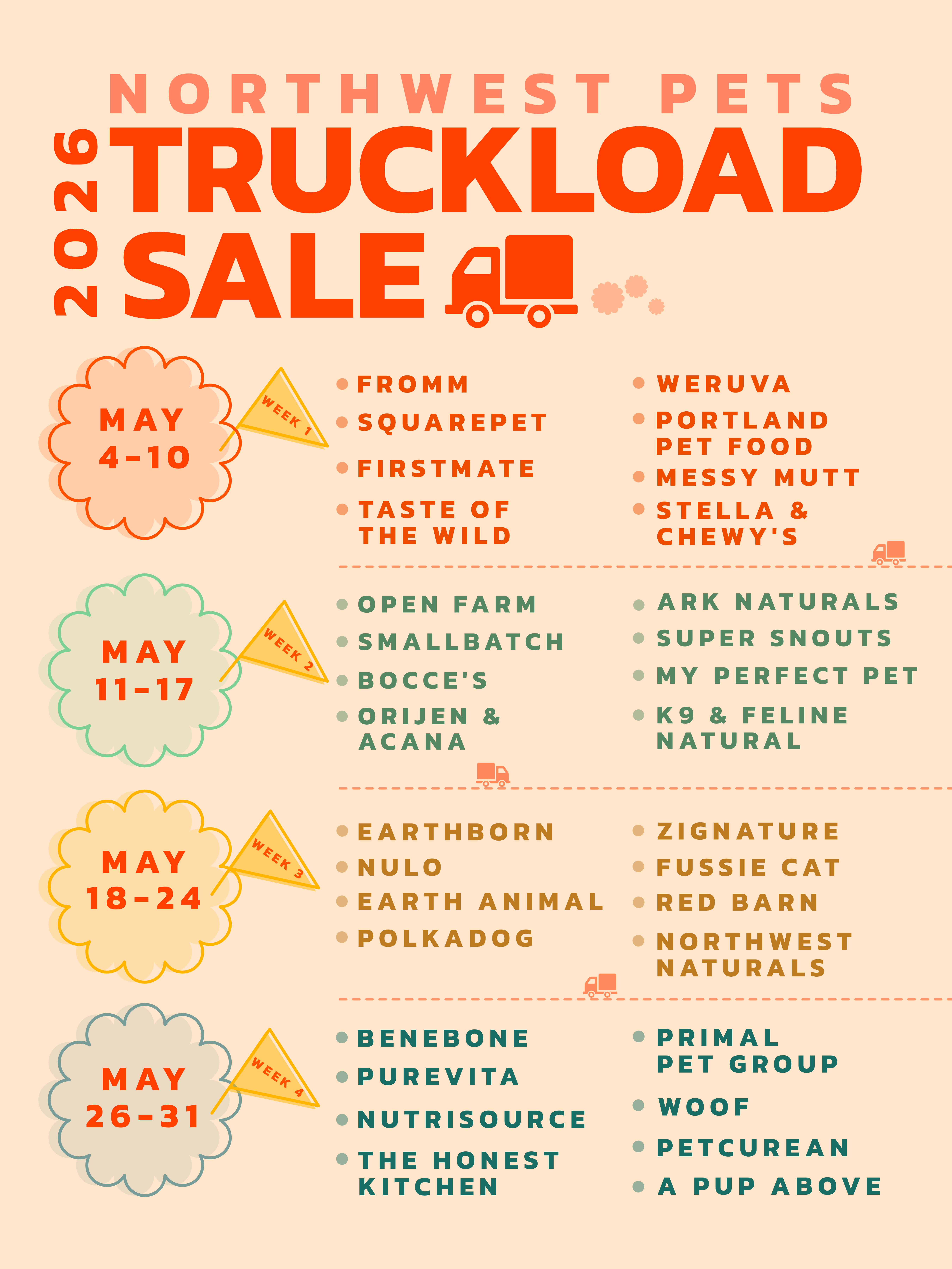 It's almost time for our 2026 Truckload Sale - one of our biggest sales of the year! Stock up on your pet’s favorite brands at unbeatable prices. Each week in May, select brands will be on sale. Check the schedule below for details and dates.